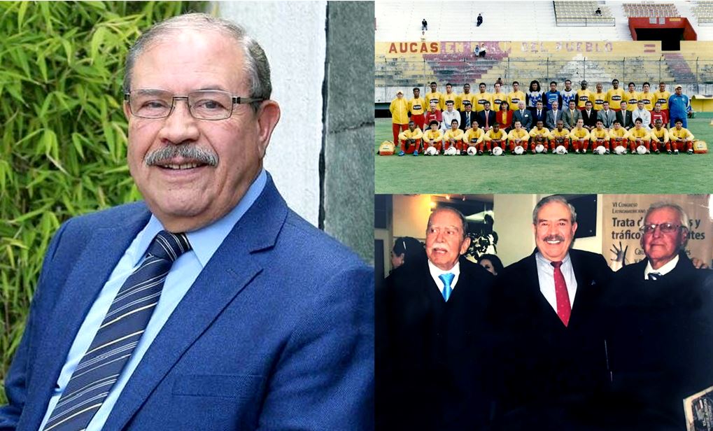 Foto: Dr. Ramiro Montenegro López en la actualidad. Derecha superior, con el equipo de Sociedad Deportiva Aucas en el 2004. Derecha inferior, en 2018, en la presentación de El súper clásico Quiteño, consta con dos glorias del Aucas: Oswaldo Rodríguez Coll, centrodelantero de 1954 y 1955; y Gustavo Guerrero, defensa central de 1969 y 1970.