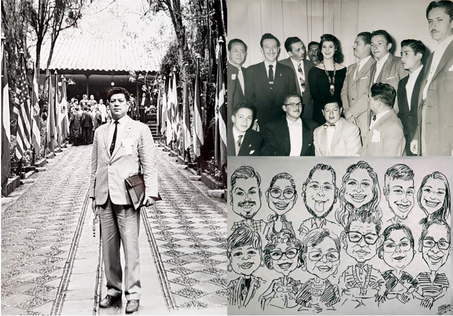 Foto: Izquierda: René Torres en 1970 en un taller en Colombia que le envío Ciespal. Derecha superior: En 1958 con la Miss Universo, la colombiana Luz Elena Zuloaga; Eduardo Brito, Guillermo Jácome Jiménez, Édgar Terán, Gustavo Herdoíza, entre otros. Derecha inferior una caricatura de la familia Torres Zaldumbide. Superior (nietos): Carlos, Belén, José Luis, María Isabel, Sergio y Valeria. Inferior: (padres e hijos): Janeth, Delcy, Elvia (mamá), René (papá), María Luisa y René Jr. Falta la bisnieta Sarita.
